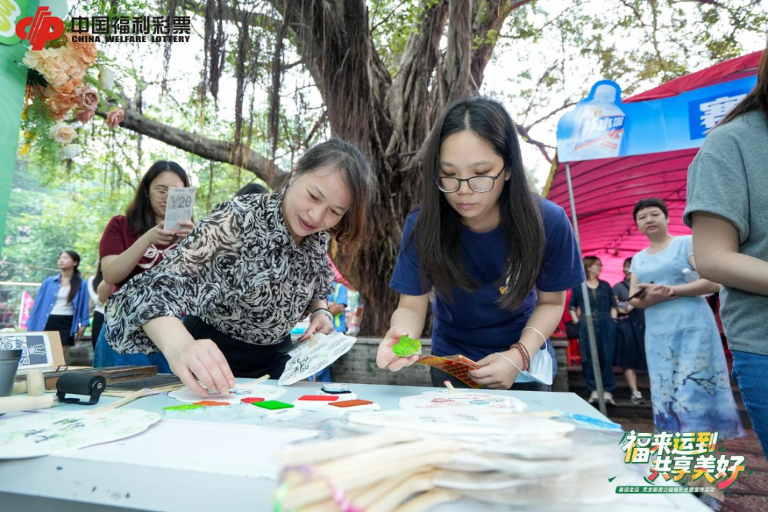 广州福彩与“潮墟”非遗品牌合作,在龙潭村龙船景活动中推出“福来运到 共享美好”公益主题宣传活动,活动现场设置非遗拓印体验环节,邀请木刻艺术家指导市民制作拓印画扇,并将福彩公益展示、趣味互动与非遗活动融为一体,以龙舟文化和传统技艺为纽带,打造“福彩+非遗”沉浸式跨界新体验。