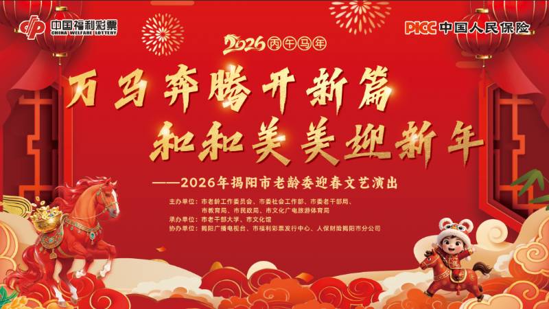 2月4日下午,由市老龄委、市委社会工作部、市委老干部局、市教育局、市民政局、市文广旅游体育局、市电视台、市老干部大学、市文化馆、市福利彩票发行中心、人保财险揭阳市分公司等单位共同举办的"万马奔腾开新篇 和和美美迎新年"文艺演举行。
