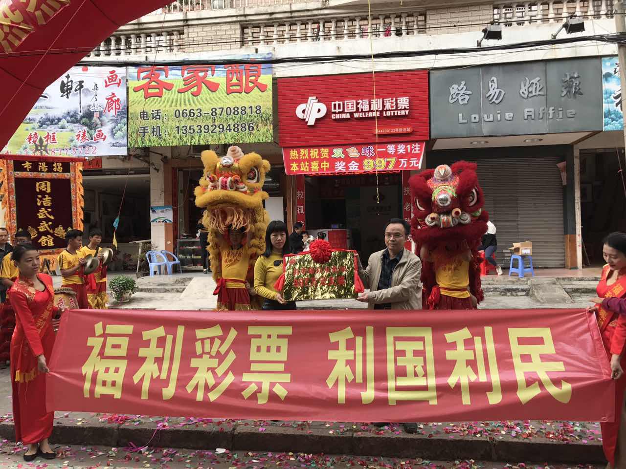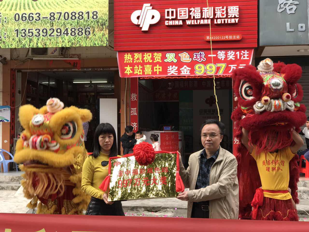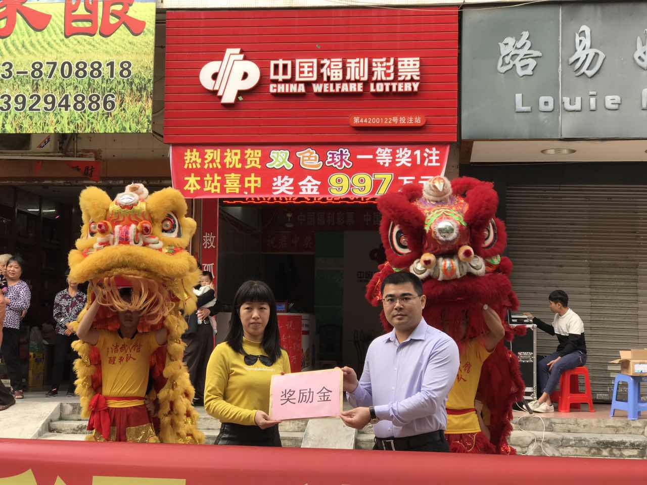 12月6日上午,揭阳市区东二路金龙花园026号铺面44200122网点福彩投注站醒狮起舞,喜庆气氛洋溢,揭阳市福彩中心卢树华主任带领中心工作人员为该投注站举行庆祝活动,热烈庆祝该站点中出双色球第2016137期一等奖单注997万多元,成为2016年揭阳市第三个中出双色球一等奖的站点。