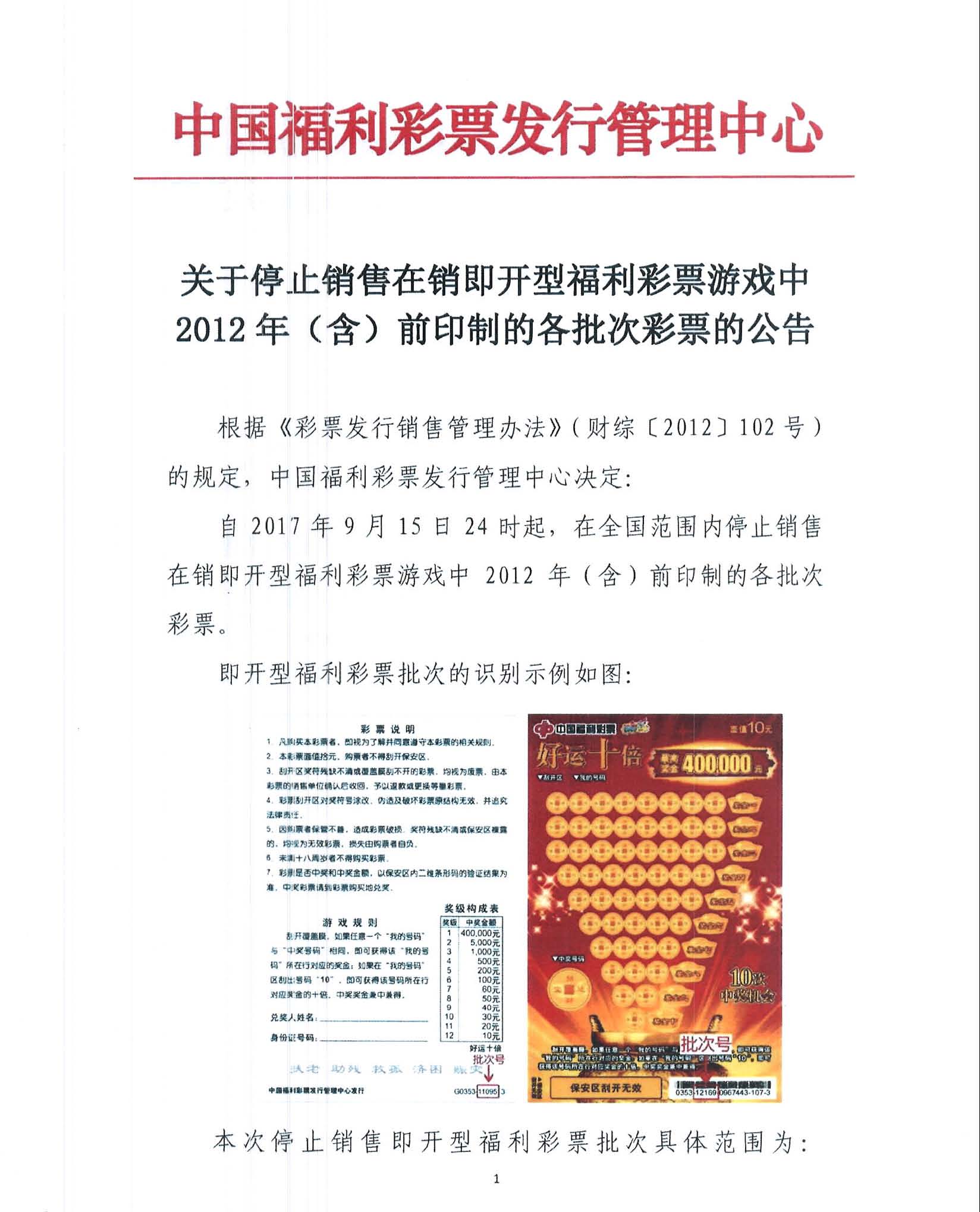 关于停止销售在销即开型福利彩票游戏中2012年(含)前印制的各批次彩票的公告