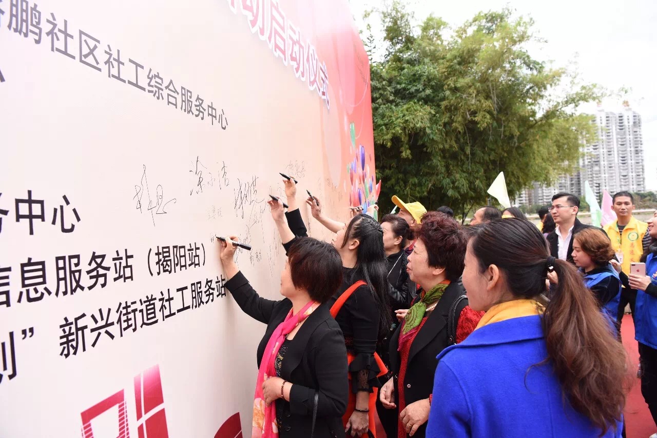 社工代表、市天蓝心理服务中心主任许琼珊发言,分享了其做社工的心路历程,向广大群众普及社会工作知识。与会领导、社工、志愿者代表及市民朋友一同在主背景墙上签下自己的名字。