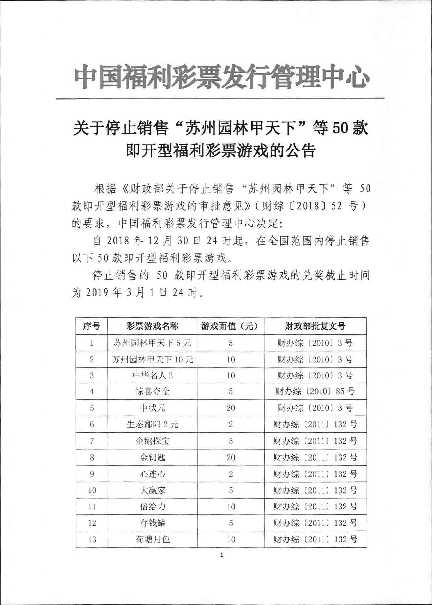 关于停止销售“苏州园林甲天下”等50款即开型福利彩票游戏的公告