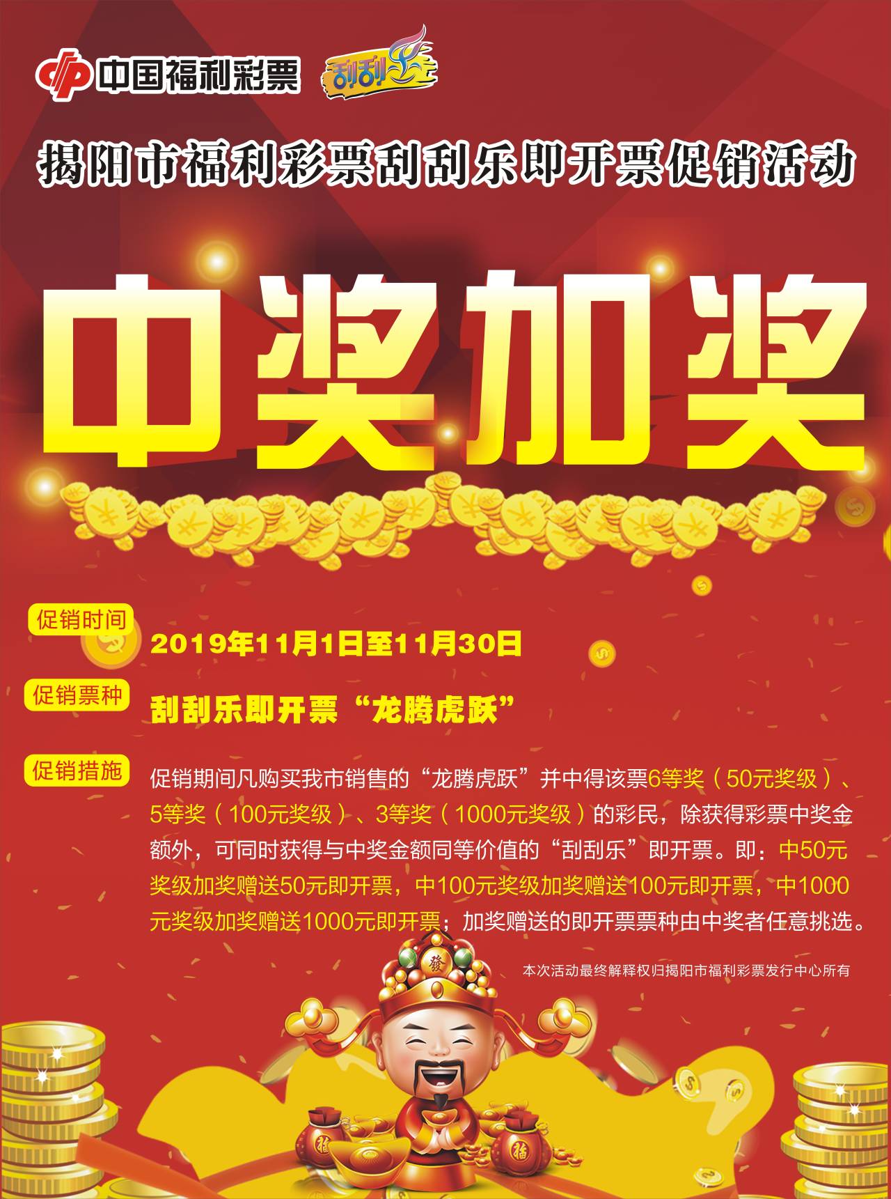 促销期间,凡购买我市销售的“龙腾虎跃”并中得该票6等奖(50元奖级)、5等奖(100元奖级)、3等奖(1000元奖级)的彩民,除获得彩票中奖金额外,可同时获得与中奖金额同等价值的“刮刮乐”即开票。即:中50元奖级加奖赠送50元即开票,中100元奖级加奖赠送100元即开票,中1000元奖级加奖赠送1000元即开票;加奖赠送的即开票票种由中奖者任意挑选。