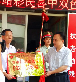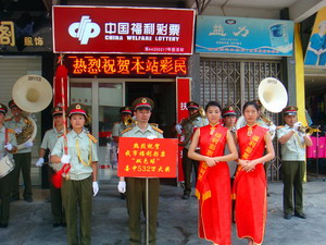 2015年7月3日上午,揭阳市福彩中心主任卢树华及其工作人员携礼仪管乐队和宣传彩车来到揭东区城西44200217投注站进行庆贺,向投注站颁发了一等奖中奖奖状和牌匾。路过的行人纷纷驻足观看,成为路上一道亮丽的风景线。当得知是彩站出了头奖532万的消息后,不少人怀着“借点喜气”的心理,走进投注站购彩。