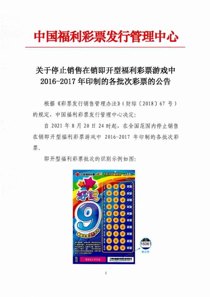 关于停止销售在销即开型福利彩票游戏中2016-2017年印制的各批次彩票的公告