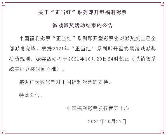 关于“正当红”系列即开型福利彩票游戏派奖活动结束的公告