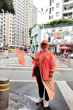 正值高温天气,又是广东“龙舟水”雨季,时晴时雨,每个路口行人、电动车、汽车夹杂,他们配合交警,引导大家按红绿灯、手势和旗号指引过路口。穿上雨衣、工作马甲在雨中执行工作,他们身上的衣服干了湿、湿了干。