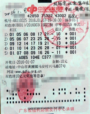 2016年开门红,新年第三期双色球开奖,中山就迎来了一注头奖。1月7日晚,双色球第2016003期开奖,当期开奖号码为红球:01、10、14、23、26、28,蓝球:01。当期全国井喷12注一等奖,单注奖金为675万多元。广东省揽获其中2注头奖,其中一注花落中山,大奖出自位于中山市黄圃镇马安村兴马路37号的44110325号福彩投注站,中奖彩票是一张10元5注号码的单式自选彩票。