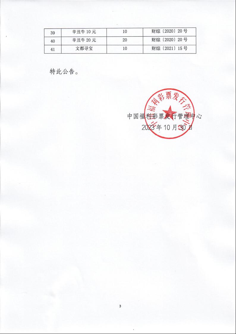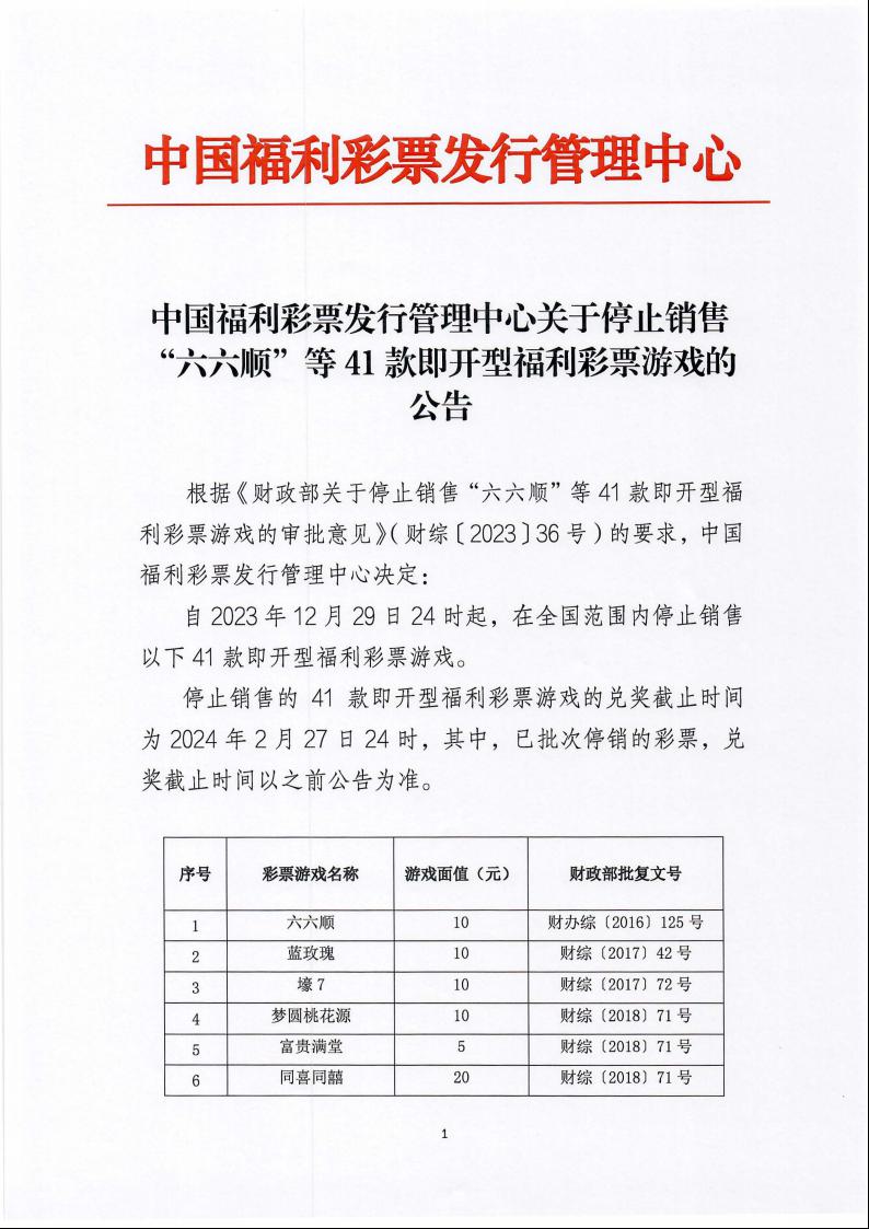 中国福利彩票发行管理中心关于停止销售“六六顺”等41款即开型福利彩票游戏的公告