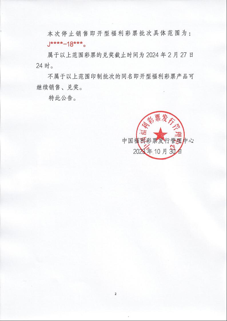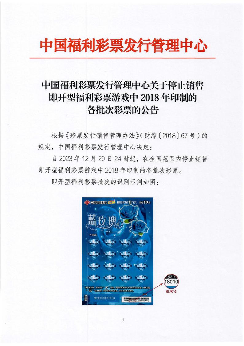 中国福利彩票发行管理中心关于停止销售即开型福利彩票游戏中2018年印制的各批次彩票