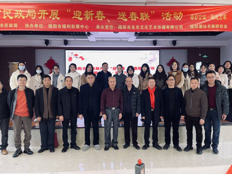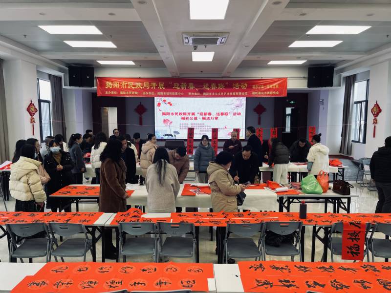 为了写好春联,书法家们在现场不顾疲倦,应不同民政服务群体的要求,用楷书、行书、隶书等书法体,即席挥毫,撰写春联,将美好的祝福化作一幅幅寓意吉祥的春联,带着辞旧迎新的美好祝福,为即将来临的春节增添了浓浓的喜庆氛围。现场工作人员细心接待现场观摩群众和服务对象,体现了民政系统对广大服务对象的关爱和祝福之情,营造了祥和的节日气氛。揭阳市民政局、揭阳市福利彩票发行中心将在春节前把蕴含着满满祝福的春联与福字送给基层干部、民政服务对象、乡村振兴挂钩村和福利彩票销售站点,用群众喜闻乐见的形式送“廉”送“福”到基层,为广大党员干部群众送上新年祝福。