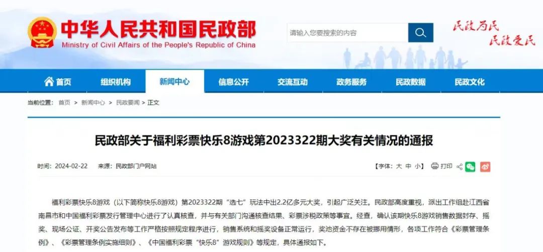 经核查,2023年12月2日21:00快乐8游戏第2023322期销售结束后,中国福利彩票发行管理中心按照《彩票管理条例》及其实施细则等相关规定,对该期原始销售数据进行封存;21:30至21:35,在2名公证人员的监督下摇出了二十个开奖号码。摇奖过程在中国福彩网(www.cwl.gov.cn)等平台直播,视频可在中国福彩网观看。