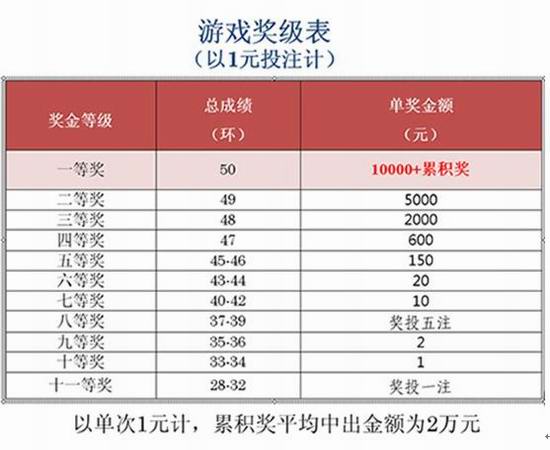 好运射击是一款手枪射击类游戏。每射击5枪为一次投注,按照5枪射击成绩的总和计为本次投注总成绩,若总成绩满足中奖规则,则获得相应奖项。